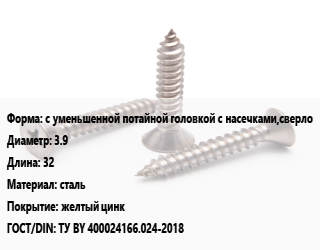 Саморез с уменьшенной потайной головкой с насечками,сверло D=3.9 L=32 сталь желтый цинк ГОСТ: ТУ BY 400024166.024-2018