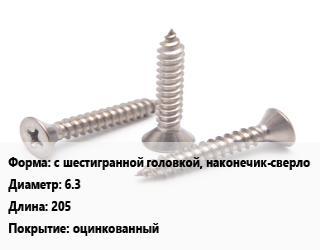 Саморез с шестигранной головкой, наконечик-сверло D=6.3 L=205 оцинкованный