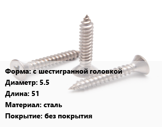 Саморез с шестигранной головкой D=5.5 L=51 сталь без покрытия