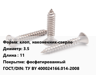 Саморез клоп, наконечник-сверло D=3.5 L=11 фосфатированный ГОСТ: ТУ BY 400024166.014-2008