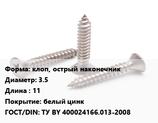 Саморез клоп, острый наконечник D=3.5 L=11 белый цинк ГОСТ: ТУ BY 400024166.013-2008