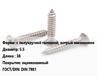 Саморез с полукруглой головкой, острый наконечник D=5.5 L=38 оцинкованный ГОСТ: DIN 7981