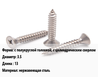 Саморез с полукруглой головкой, с цилиндрическим сверлом D=3.5 L=13 нержавеющая сталь