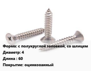 Саморез с полукруглой головкой, со шлицем D=4 L=60 оцинкованный