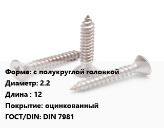 Саморез с полукруглой головкой D=2.2 L=12 оцинкованный ГОСТ: DIN 7981