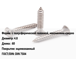 Саморез с полусферической головкой, наконечник-сверло D=4.8 L=60 оцинкованный ГОСТ: DIN 7504