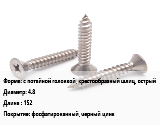 Саморез с потайной головкой, крестообразный шлиц, острый D=4.8 L=152 фосфатированный, черный цинк