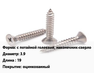 Саморез с потайной головкой, наконечник-сверло D=3.9 L=19 оцинкованный