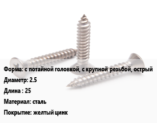Саморез с потайной головкой, с крупной резьбой, острый D=2.5 L=25 сталь желтый цинк