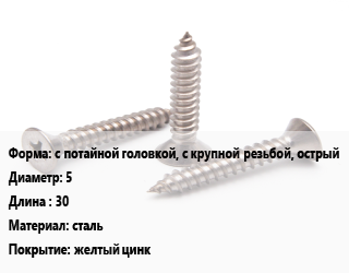 Саморез с потайной головкой, с крупной резьбой, острый D=5 L=30 сталь желтый цинк