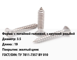 Саморез с потайной головкой, с крупной резьбой D=3.5 L=19 желтый цинк ГОСТ: ТУ 7811-7357 BY 010