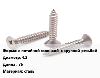 Саморез с потайной головкой, с крупной резьбой D=4.2 L=75 сталь