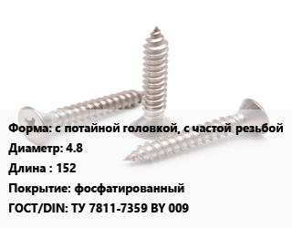 Саморез с потайной головкой, с частой резьбой D=4.8 L=152 фосфатированный ГОСТ: ТУ 7811-7359 BY 009