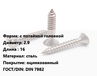 Саморез с потайной головкой D=2.9 L=16 сталь оцинкованный ГОСТ: DIN 7982