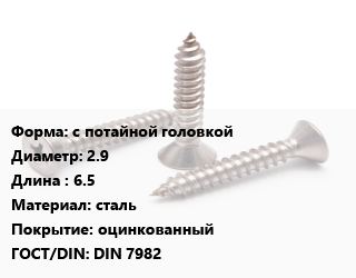 Саморез с потайной головкой D=2.9 L=6.5 сталь оцинкованный ГОСТ: DIN 7982