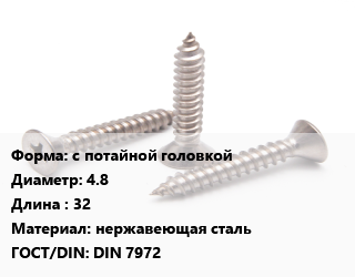 Саморез с потайной головкой D=4.8 L=32 нержавеющая сталь ГОСТ: DIN 7972
