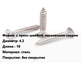 Саморез с пресс-шайбой, наконечник-сверло D=4.2 L=19 сталь без покрытия