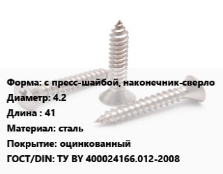 Саморез с пресс-шайбой, наконечник-сверло D=4.2 L=41 сталь оцинкованный ГОСТ: ТУ BY 400024166.012-2008
