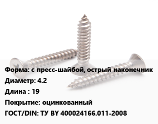 Саморез с пресс-шайбой, острый наконечник D=4.2 L=19 оцинкованный ГОСТ: ТУ BY 400024166.011-2008