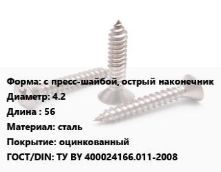 Саморез с пресс-шайбой, острый наконечник D=4.2 L=56 сталь оцинкованный ГОСТ: ТУ BY 400024166.011-2008