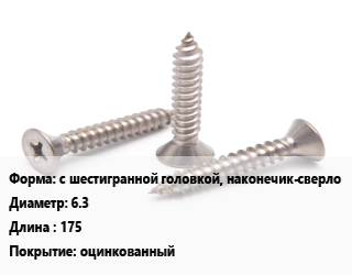 Саморез с шестигранной головкой, наконечик-сверло D=6.3 L=175 оцинкованный
