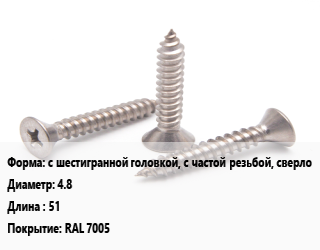 Саморез с шестигранной головкой, с частой резьбой, сверло D=4.8 L=51 RAL 7005