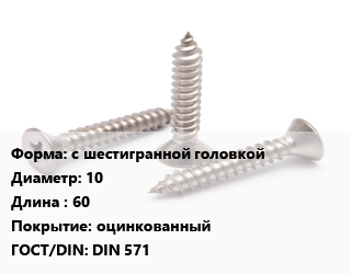 Саморез с шестигранной головкой D=10 L=60 оцинкованный ГОСТ: DIN 571