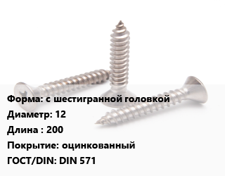 Саморез с шестигранной головкой D=12 L=200 оцинкованный ГОСТ: DIN 571
