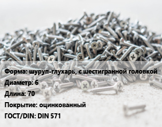 Шуруп шуруп-глухарь, с шестигранной головкой 6х70 оцинкованный ГОСТ: DIN 571