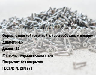 Шуруп с плоской головкой, с крестообразным шлицем 4.5х12 нержавеющая сталь без покрытия ГОСТ: DIN 571