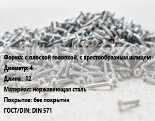 Шуруп с плоской головкой, с крестообразным шлицем 4х12 нержавеющая сталь без покрытия ГОСТ: DIN 571