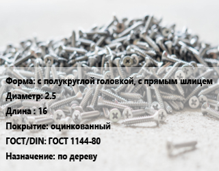 Шуруп с полукруглой головкой, с прямым шлицем 2.5х16 оцинкованный ГОСТ: ГОСТ 1144-80 по дереву