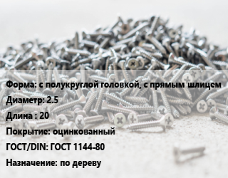 Шуруп с полукруглой головкой, с прямым шлицем 2.5х20 оцинкованный ГОСТ: ГОСТ 1144-80 по дереву