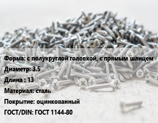 Шуруп с полукруглой головкой, с прямым шлицем 3.5х13 сталь оцинкованный ГОСТ: ГОСТ 1144-80