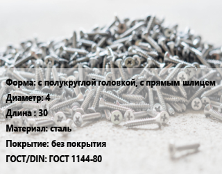 Шуруп с полукруглой головкой, с прямым шлицем 4х30 сталь без покрытия ГОСТ: ГОСТ 1144-80