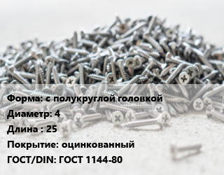 Шуруп с полукруглой головкой 4х25 оцинкованный ГОСТ: ГОСТ 1144-80