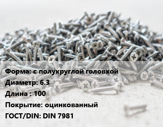 Шуруп с полукруглой головкой 6.3х100 оцинкованный ГОСТ: DIN 7981