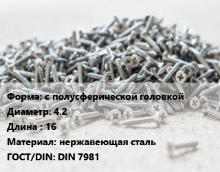 Шуруп с полусферической головкой 4.2х16 нержавеющая сталь ГОСТ: DIN 7981