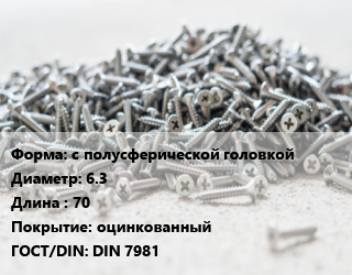 Шуруп с полусферической головкой 6.3х70 оцинкованный ГОСТ: DIN 7981
