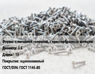 Шуруп с потайной головкой, с крестообразным шлицем 3.5х13 оцинкованный ГОСТ: ГОСТ 1145-80