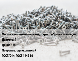 Шуруп с потайной головкой, с крестообразным шлицем 4х18 оцинкованный ГОСТ: ГОСТ 1145-80