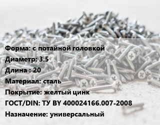 Шуруп с потайной головкой 3.5х20 сталь желтый цинк ГОСТ: ТУ BY 400024166.007-2008 универсальный