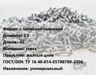 Шуруп с потайной головкой 3.5х35 сталь желтый цинк ГОСТ: ТУ 16 40-014-55798700-2006 универсальный