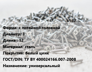 Шуруп с потайной головкой 3х12 сталь белый цинк ГОСТ: ТУ BY 400024166.007-2008 универсальный