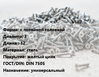 Шуруп с потайной головкой 3х12 сталь желтый цинк ГОСТ: DIN 7505 универсальный