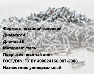 Шуруп с потайной головкой 4.5х35 сталь желтый цинк ГОСТ: ТУ BY 400024166.007-2008 универсальный