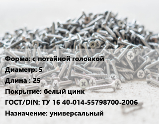 Шуруп с потайной головкой 5х25 белый цинк ГОСТ: ТУ 16 40-014-55798700-2006 универсальный