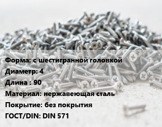 Шуруп с шестигранной головкой 4х90 нержавеющая сталь без покрытия ГОСТ: DIN 571