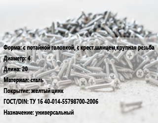 Шуруп с потайной головкой, с крест.шлицем,крупная резьба 4х20 сталь желтый цинк ГОСТ: ТУ 16 40-014-55798700-2006 универсальный