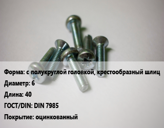 Винт с полукруглой головкой, крестообразный шлиц 6х40 DIN 7985 оцинкованный, кг цена от 447.28 сом / кг, где купить, условия доставки в Бишкеке и Чуйской области